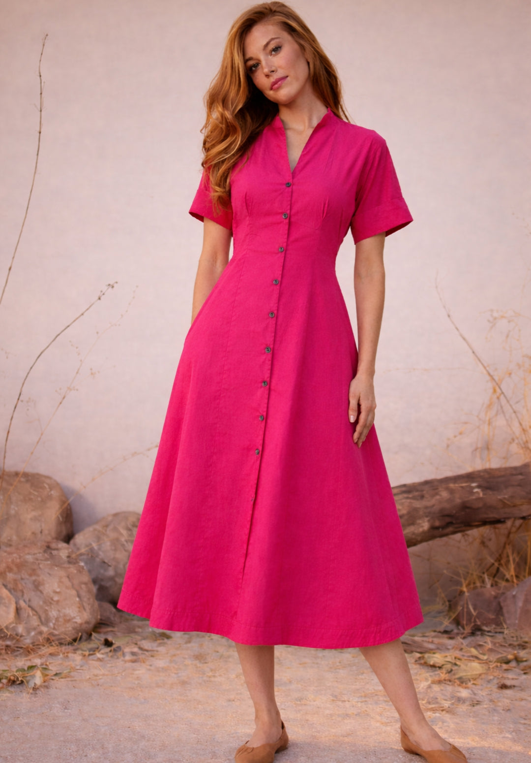 Pink Pure Cotton A-Line Buttoned Dress