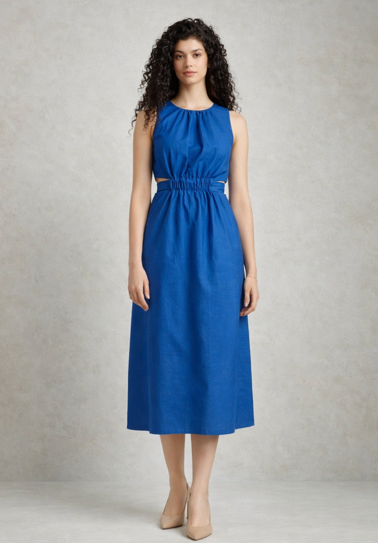 Effortless elegance meets everyday comfort in this blue pure cotton A-line dress. Crafted from breathable cotton poplin, the fitted bodice and flared skirt create a flattering silhouette that moves beautifully. Classic shirt collar and button-down front add tailored sophistication, while the gathered waist provides gentle volume through the hips. Versatile enough for casual brunches or semi-formal occasions, style it with heels for polish or sneakers for relaxed charm. A wardrobe essential that transitions seamlessly from day to night.