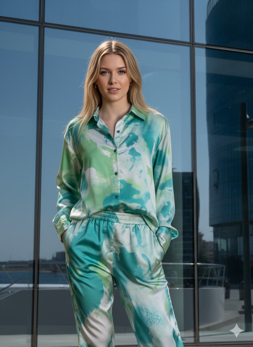 Green Printed Satin Co-ords