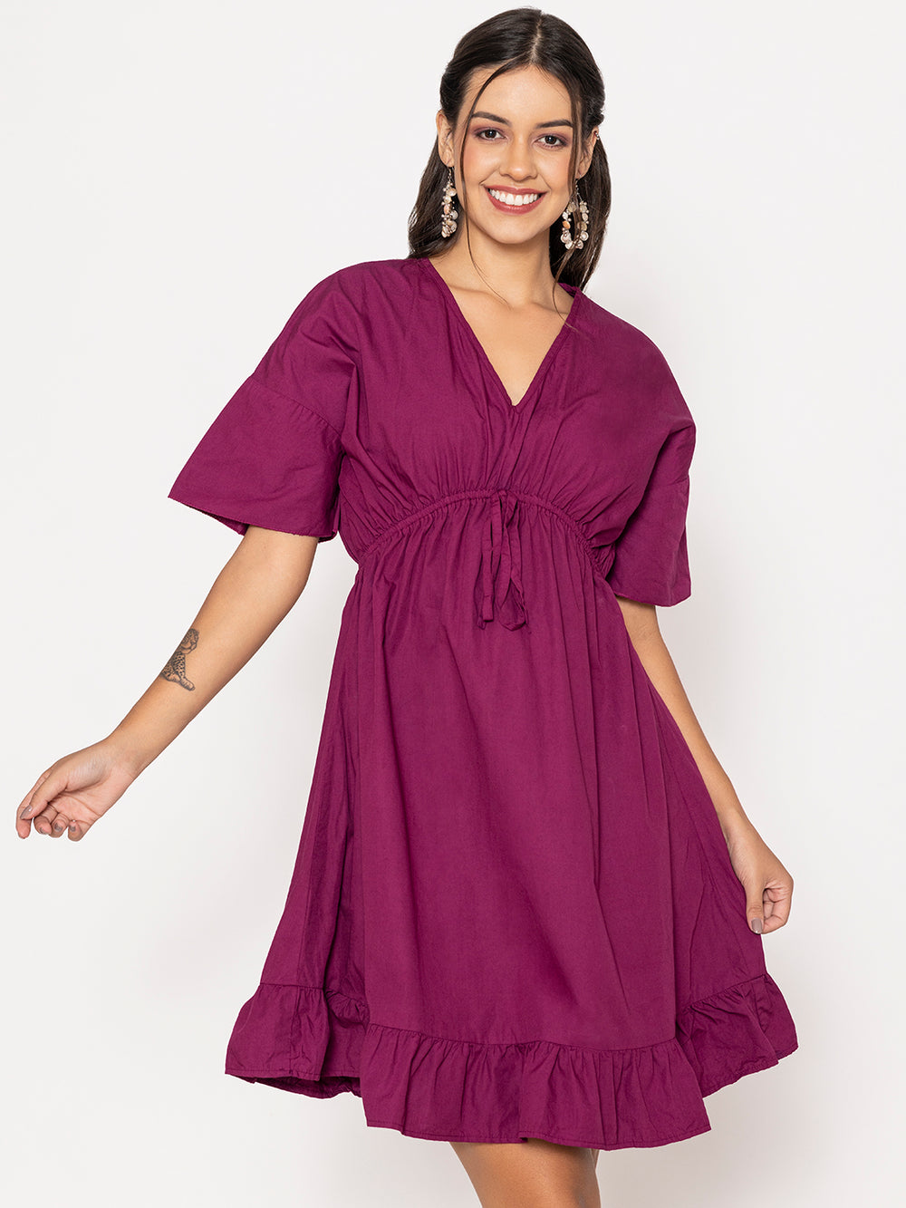Wine Pure Cotton V-Neck Dress
