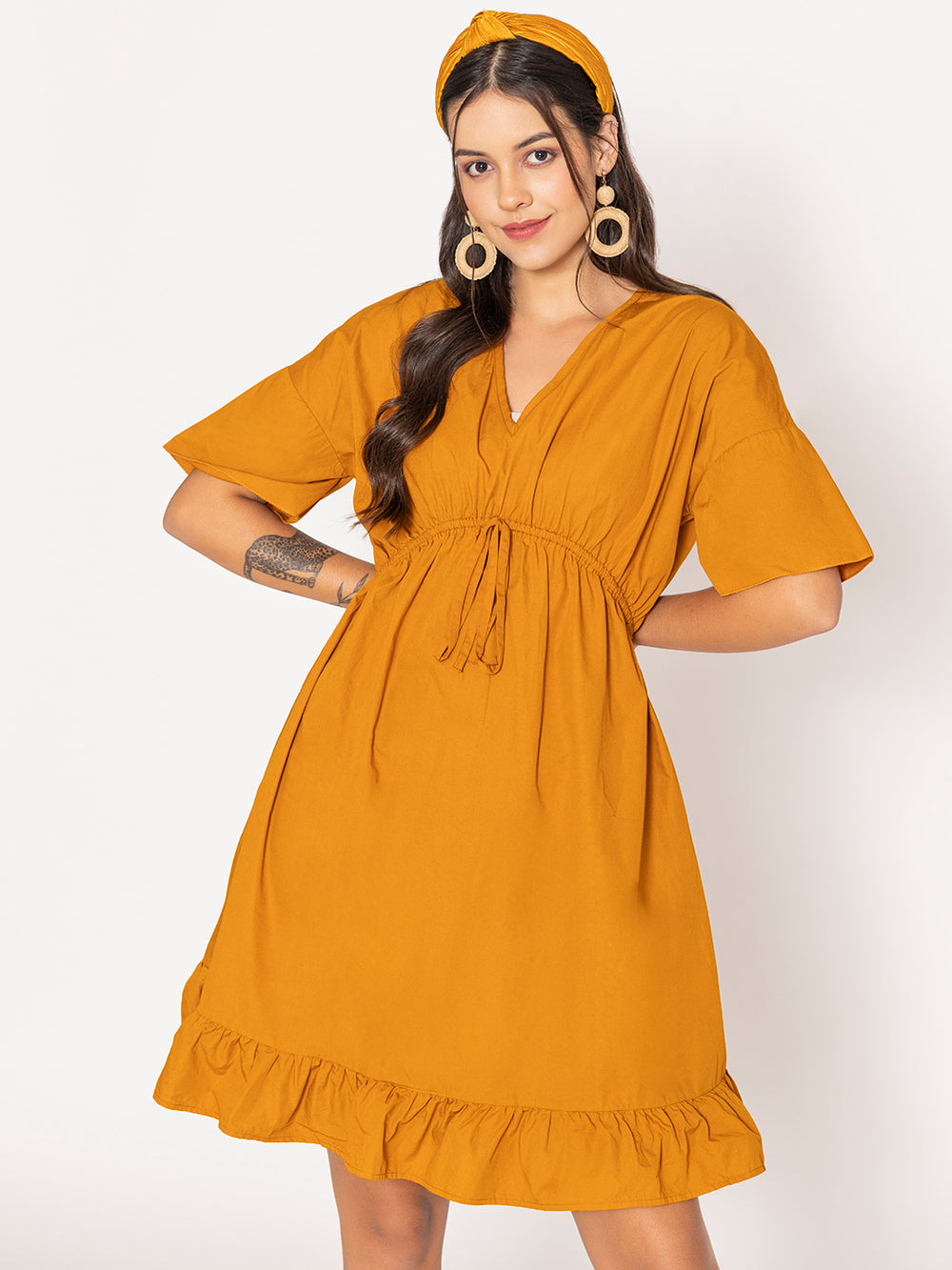 Tan Brown Pure Cotton V-Neck Dress