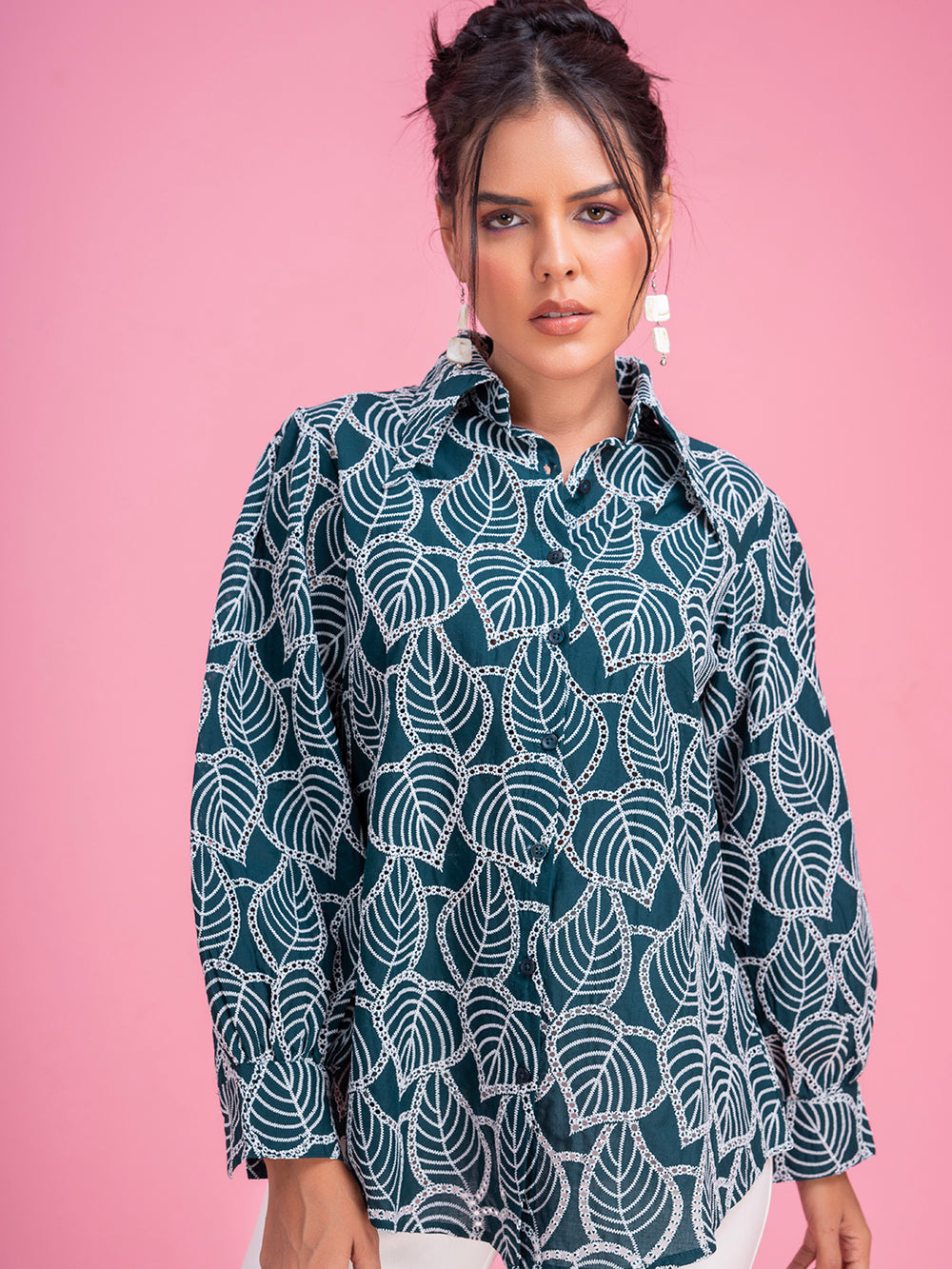 Green Printed Kurta Satin Relaxed Fit Shirt